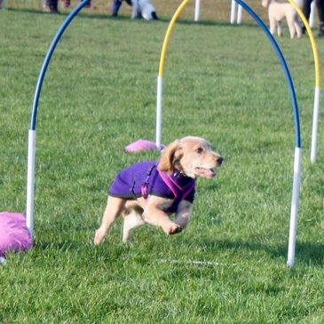 Hoopers, although similar in handling to agility , is perfect for young dogs or dogs who cannot do agility for whatever reason , as it is low impact. Instead of jumping, the dogs learn to run through hoops and tunnels and turn around barrels . The courses are flowing without tight turns. Young dogs can start at around 6 months old .