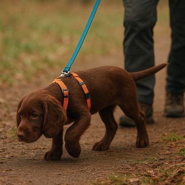 For puppies, rather than long trails, we build solid foundations with no pressure positive and exciting short trails. Everything is a game and good fun.